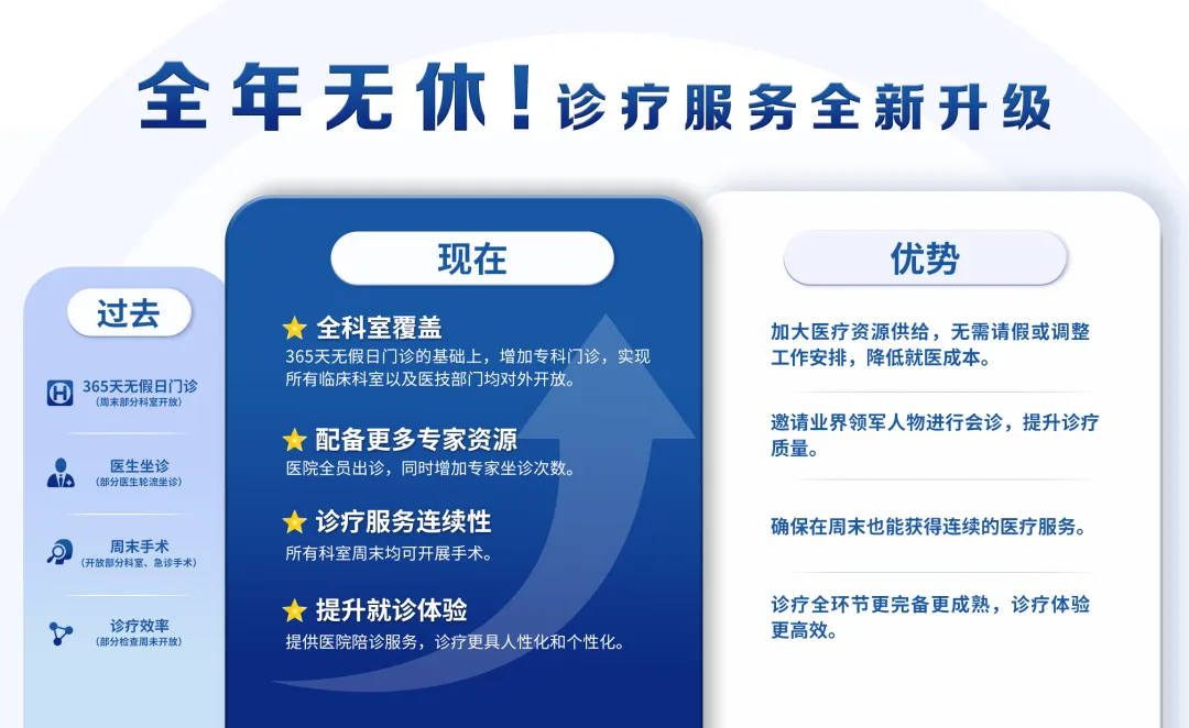 通過實(shí)施“無假日門診,診療再升級,周末開通門診”的組合方案,醫(yī)院可以在時間和服務(wù)質(zhì)量上雙重提升,確?;颊咴谌魏螘r間都能獲得高質(zhì)量的醫(yī)療服務(wù)。這不僅提高了患者的就診體驗(yàn),也增強(qiáng)了醫(yī)院的整體競爭力和服務(wù)水平,真正實(shí)現(xiàn)就醫(yī)無障礙,看病無需再請假,周末也能看醫(yī)生!