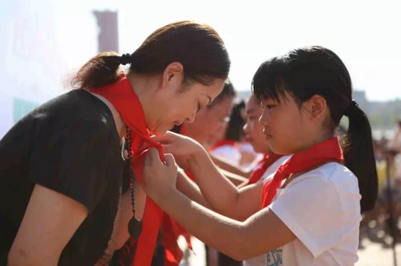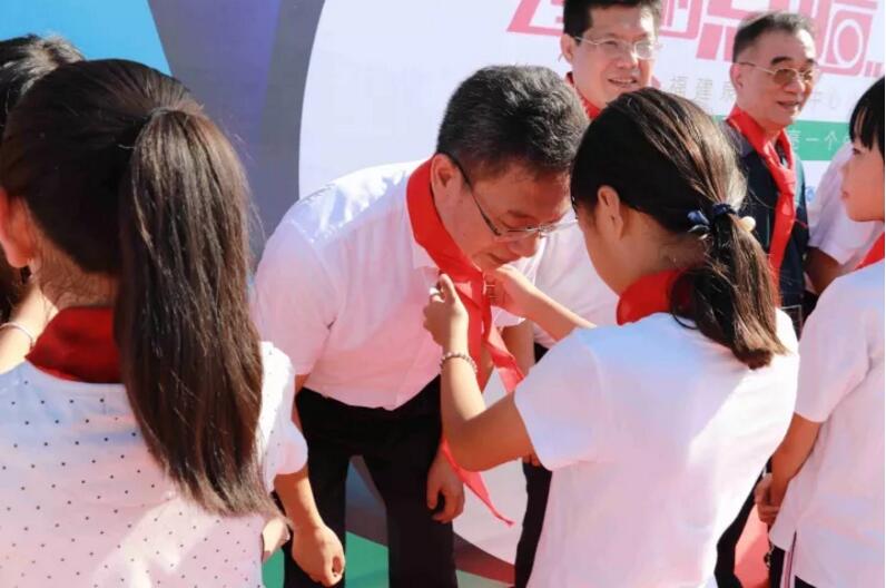 ▲學(xué)生代表為廈門眼科中心李曉峰院長系紅領(lǐng)巾